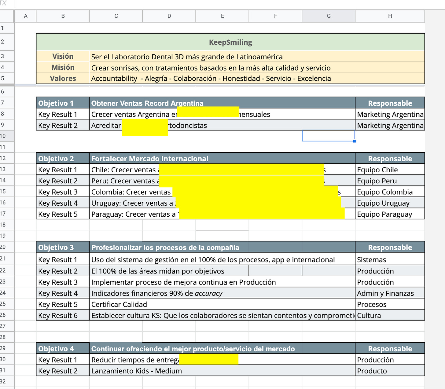 Previo a la implementación de OKR, en KeepSmiling usábamos objetivos independientes por área, con diferentes extensiones temporales y sin mucha accountability. Los indicadores eran vagos y en las áreas de soporte como administración, finanzas, recursos humanos y sistemas no usábamos prácticamente nada.
